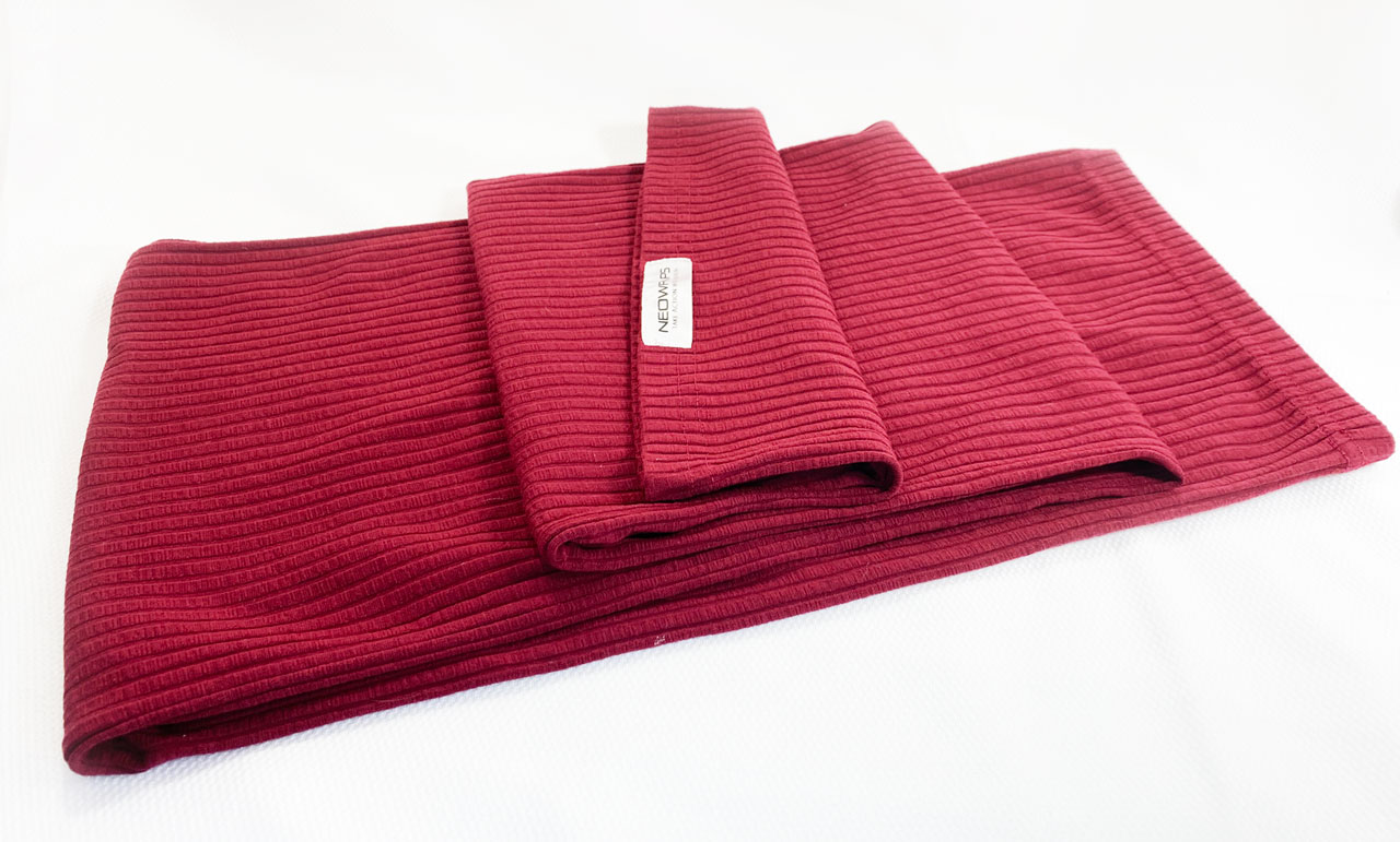 This particular maroon fabric has a textured ribbing running the length of this item. The material is a breathable cotton with a spandex style stretch.